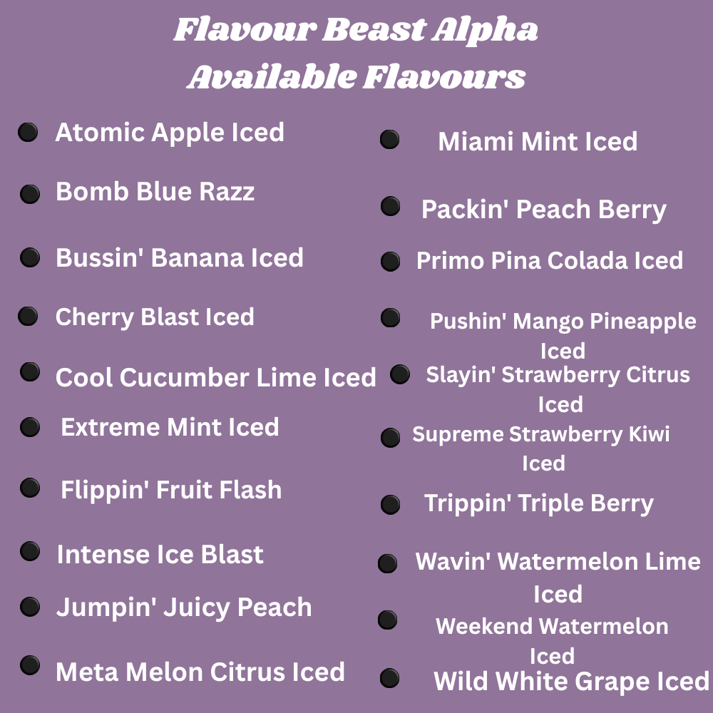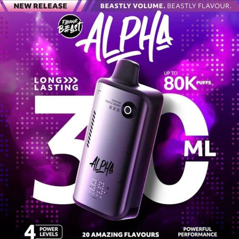 Flavour Beast Alpha 80K Disposable Vape delivers up to 80,000 puffs with a large 30mL e-liquid capacity, powered by a dual mesh coil system for enhanced flavour and smooth performance.