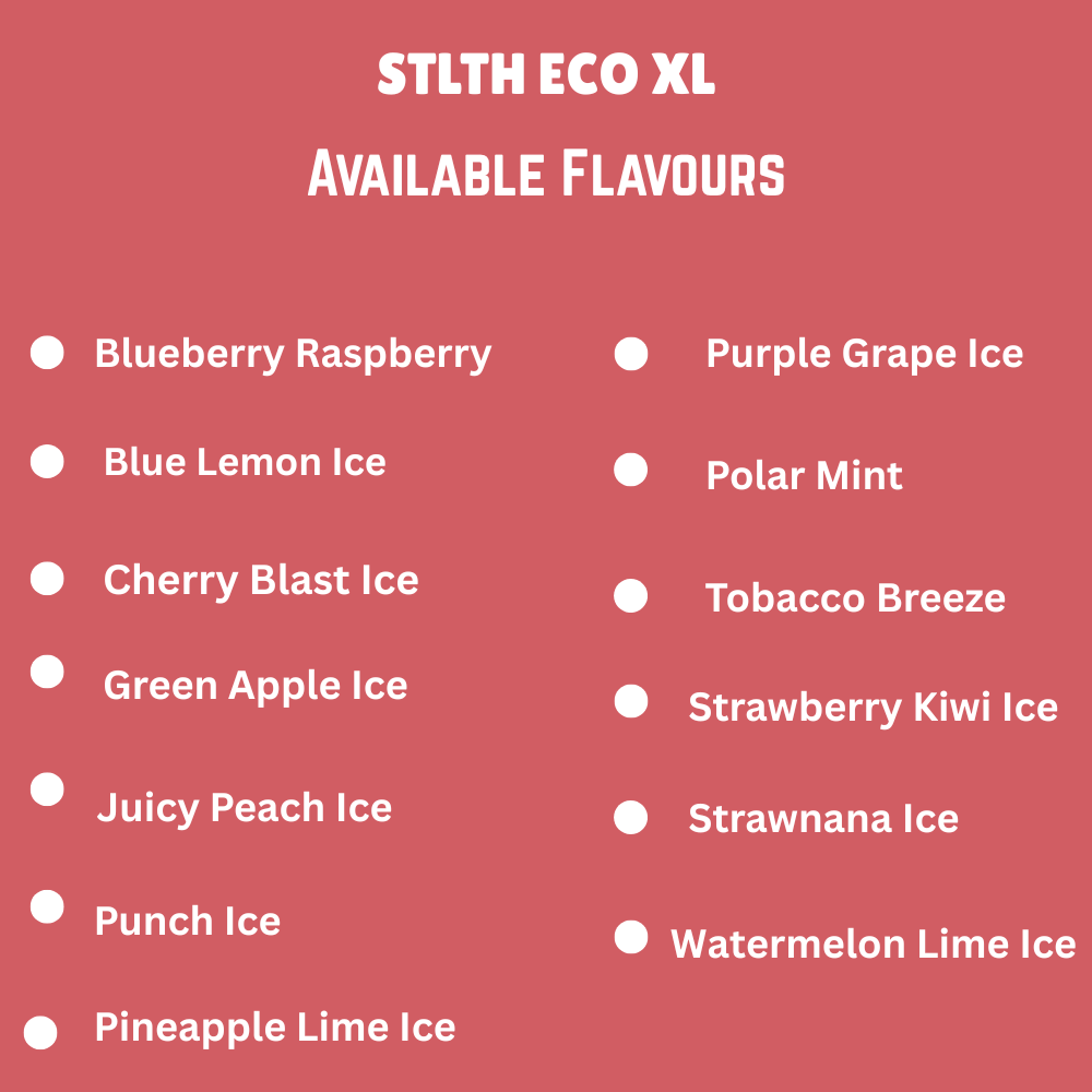 Available in 13 vibrant STLTH flavors, the ECO XL Disposable combines simplicity, versatility, and consistent performance into one pocket-friendly device. The large reservoir means fewer refills and a more cost-effective vaping solution for both casual and heavy users.